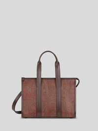 Small top-handle bag in iconic Paisley jacquard fabric, with leather details. This model can be carried crossbody,, by hand or on the shoulder, thanks to the detachable shoulder strap. • Size: 7.48 x 10.24 x 4.92 inches (19 x 26 x 12,5 cm) • Zip closure • Detachable and adjustable leather shoulder strap • Internal pocket • Golden-finish metal accessories • Made in Italy PRODUCT DETAILS • Exterior: Paisley jacquard cotton fabric coated with matt texture and lined with canvas • Coating: 100% PVC • Details: 100% leather