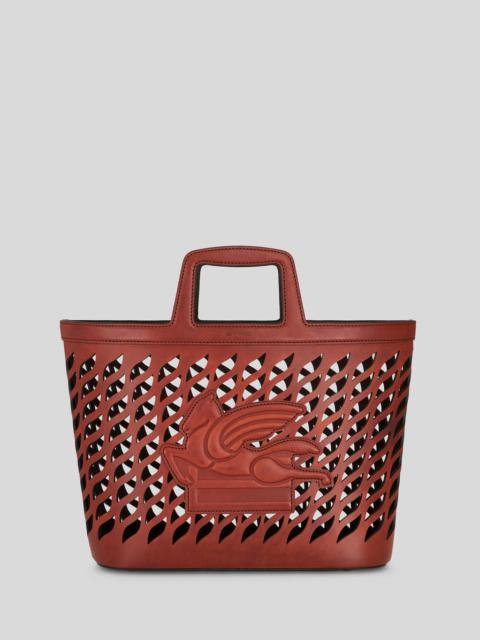 Medium lasered Coffa shopping bag featuring intarsia ETRO Pegaso logo. The bag is embellished by a hot embossed logo and has a removable pouch inside. The Coffa bag is perfect to be carried by hand. PRODUCT DETAILS • 34 x 29.5 x 12.5 cm / 8.85 x 6.10 x 3.14 inches • Exterior: 100% calfskin • Interior: 100% calfskin • Metal feet • Gold-coloured finish metal accessories • Made in Italy
