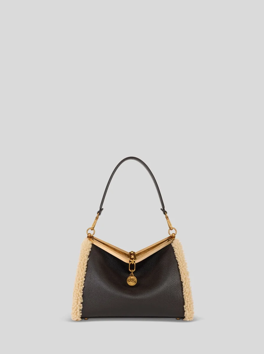 MEDIUM LEATHER VELA BAG WITH SHEARLING DETAILS
