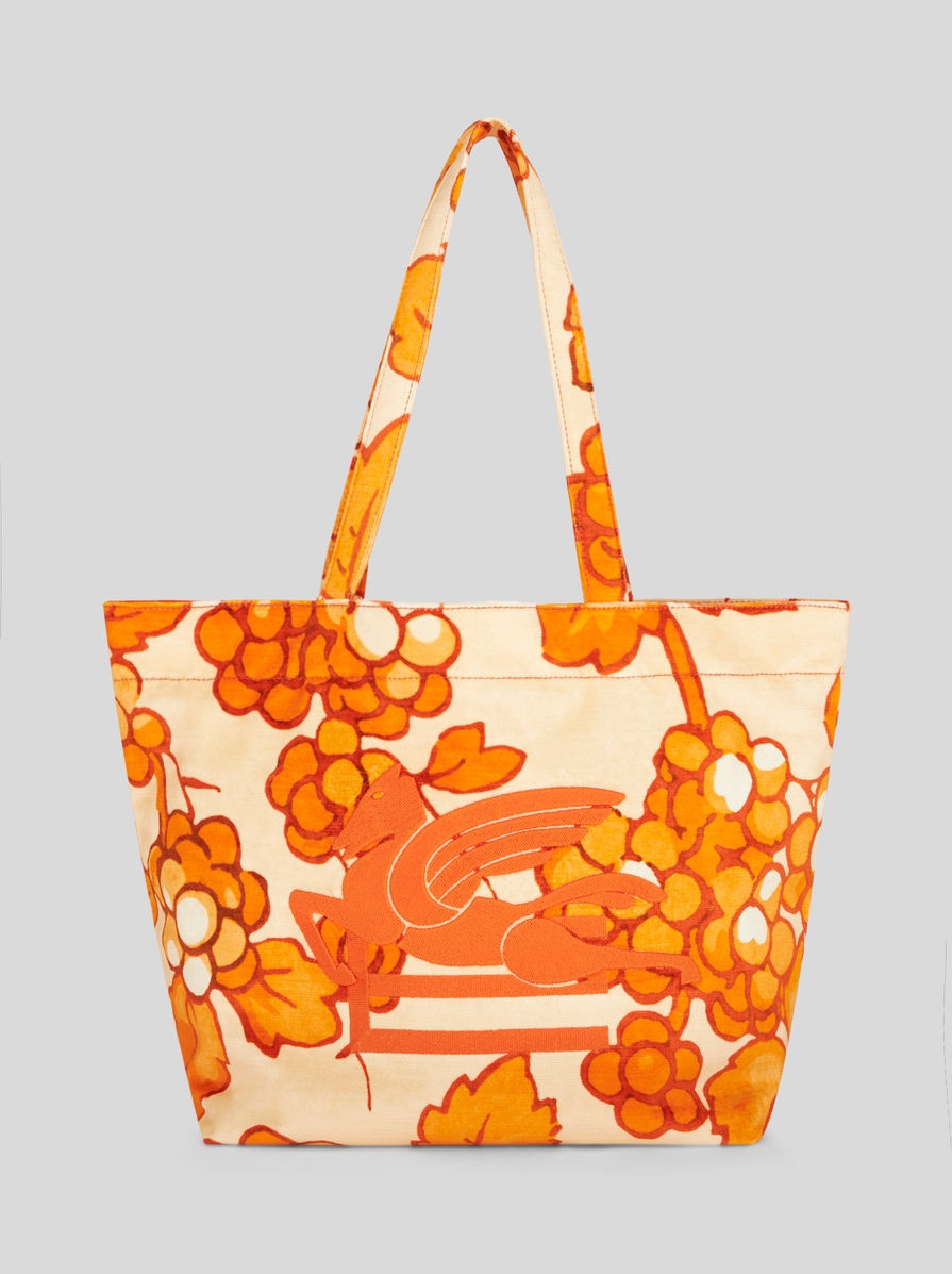 Medium Soft Trotter bag in cotton velvet decorated by a Berry print. The bag is embellished by 3D-effect embroidered ETRO Pegaso logo and a contrasting striped jacquard fabric lining. PRODUCT DETAILS • 36 x 38 x 22 cm / 14.17 x 14.96 x 8.66 inches • Exterior: 55% cotton. 45% viscose • Finish: 100% calfskin • Embroidery: 100% polyester • Lining: 100% polyester • Zipped inside pocket • Handles length (drop) 30 cm / 11.81 inches • Made in Italy