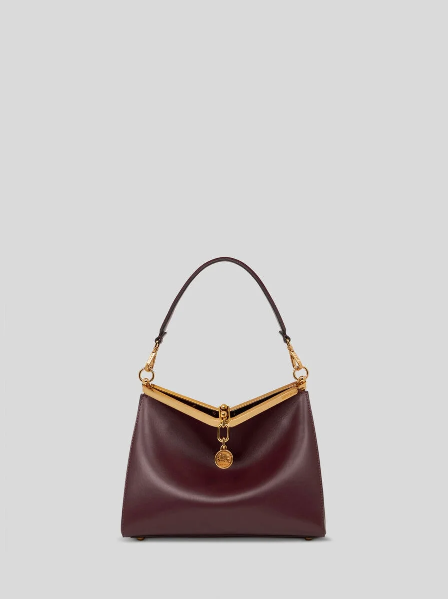 Iconic medium Vela bag in leather. This model can be carried by hand or on the shoulder thanks to the detachable and interchangeable strap and handle. This model stands out for its distinctive metal closure and the medallion bearing the ETRO logo and Pegaso symbol engraved using the same technique used to mint coins. Complete with a convenient, zip-fastened clutch inside. • Dimensions (Width, Height, Depth): 8.5 x 11 x 4.3 inches (21,5 x 28 x 11 cm) • Detachable shoulder strap • Metal feet • Removable mini pouch • Light golden-finish metal accessories • Made in Italy PRODUCT DETAILS • Exterior: 100% calfskin • Lining: 100% cowhide