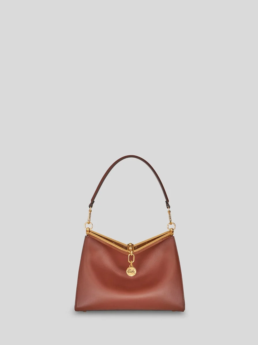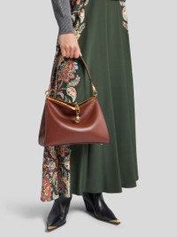 Iconic medium Vela bag in leather. This model can be carried by hand or on the shoulder thanks to the detachable and interchangeable strap and handle. This model stands out for its distinctive metal closure and the medallion bearing the ETRO logo and Pegaso symbol engraved using the same technique used to mint coins. Complete with a convenient, zip-fastened clutch inside. • Dimensions (Width, Height, Depth): 8.5 x 11 x 4.3 inches (21,5 x 28 x 11 cm) • Detachable shoulder strap • Metal feet • Removable mini pouch • Light golden-finish metal accessories • Made in Italy PRODUCT DETAILS • Exterior: 100% calfskin • Lining: 100% cowhide