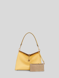 Iconic medium Vela bag in leather. This model can be carried by hand or on the shoulder thanks to the detachable and interchangeable strap and handle. This model stands out for its distinctive metal closure and the medallion bearing the ETRO logo and Pegaso symbol engraved using the same technique used to mint coins. Complete with a convenient, zip-fastened clutch inside. • Dimensions (Width, Height, Depth): 8.5 x 11 x 4.3 inches (21,5 x 28 x 11 cm) • Detachable shoulder strap • Metal feet • Removable mini pouch • Light golden-finish metal accessories • Made in Italy PRODUCT DETAILS • Exterior: 100% calfskin • Lining: 100% cowhide