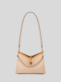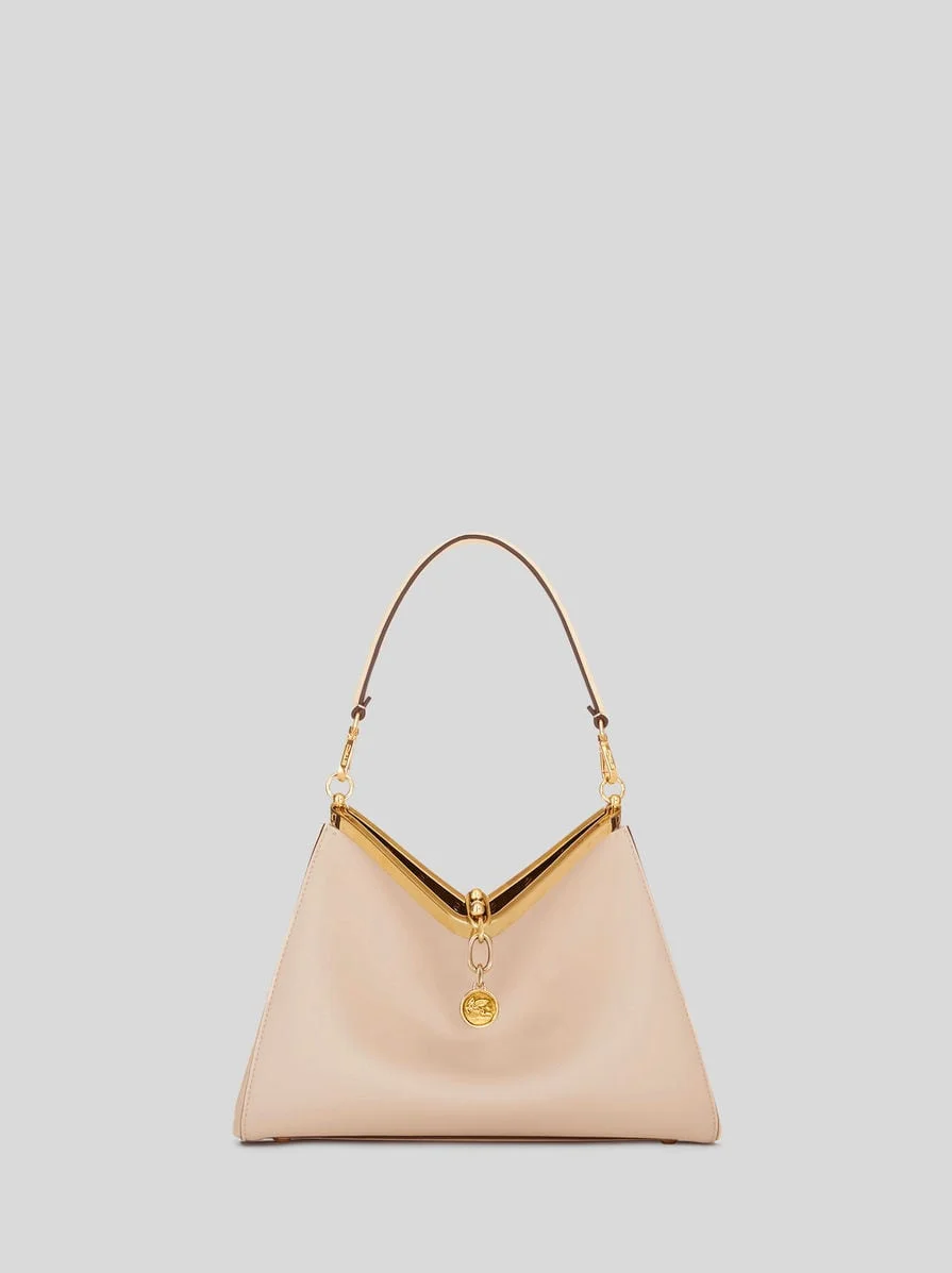 Medium leather Vela bag from the Women's Fall-Winter 2023 Fashion Show collection featuring a metal fastening with chain embellished by a medal with ETRO and Pegaso logo. The bag has a suede pouch inside and is perfect to be worn as a shoulder bag or as a crossbody bag. PRODUCT DETAILS • 28 x 21 x 12 cm / 11,02 x 8,26 x 4,72 inches • Exterior: 100% calfskin • Interior: 100% calfskin • Short shoulder strap (drop) 24 cm / 9.44 inches • Long shoulder strap (drop) 48 cm / 18,89 inches • Metal feet • Pale gold finish metal accessories • Made in Italy