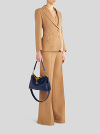 Medium leather Vela bag from the Women's Fall-Winter 2023 Fashion Show collection featuring a metal fastening with chain embellished by a medal with ETRO and Pegaso logo. The bag has a suede pouch inside and is perfect to be worn as a shoulder bag or as a crossbody bag. PRODUCT DETAILS • 28 x 21 x 12 cm / 11,02 x 8,26 x 4,72 inches • Exterior: 100% calfskin • Interior: 100% calfskin • Short shoulder strap (drop) 24 cm / 9.44 inches • Long shoulder strap (drop) 48 cm / 18,89 inches • Metal feet • Pale gold finish metal accessories • Made in Italy