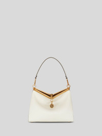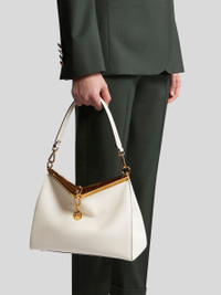 Iconic medium Vela bag in leather. This model can be carried by hand or on the shoulder thanks to the detachable and interchangeable strap and handle. This model stands out for its distinctive metal closure and the medallion bearing the ETRO logo and Pegaso symbol engraved using the same technique used to mint coins. Complete with a convenient, zip-fastened clutch inside. • Dimensions (Width, Height, Depth): 8.5 x 11 x 4.3 inches (21,5 x 28 x 11 cm) • Detachable shoulder strap • Metal feet • Removable mini pouch • Light golden-finish metal accessories • Made in Italy PRODUCT DETAILS • Exterior: 100% calfskin • Lining: 100% cowhide