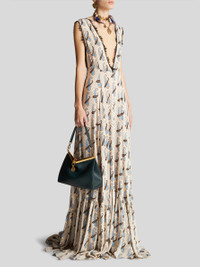 Medium leather Vela bag from the Women's Fall-Winter 2023 Fashion Show collection featuring a metal fastening with chain embellished by a medal with ETRO and Pegaso logo. The bag has a suede pouch inside and is perfect to be worn as a shoulder bag or as a crossbody bag. PRODUCT DETAILS • 28 x 21 x 12 cm / 11,02 x 8,26 x 4,72 inches • Exterior: 100% calfskin • Interior: 100% calfskin • Short shoulder strap (drop) 24 cm / 9.44 inches • Long shoulder strap (drop) 48 cm / 18,89 inches • Metal feet • Pale gold finish metal accessories • Made in Italy
