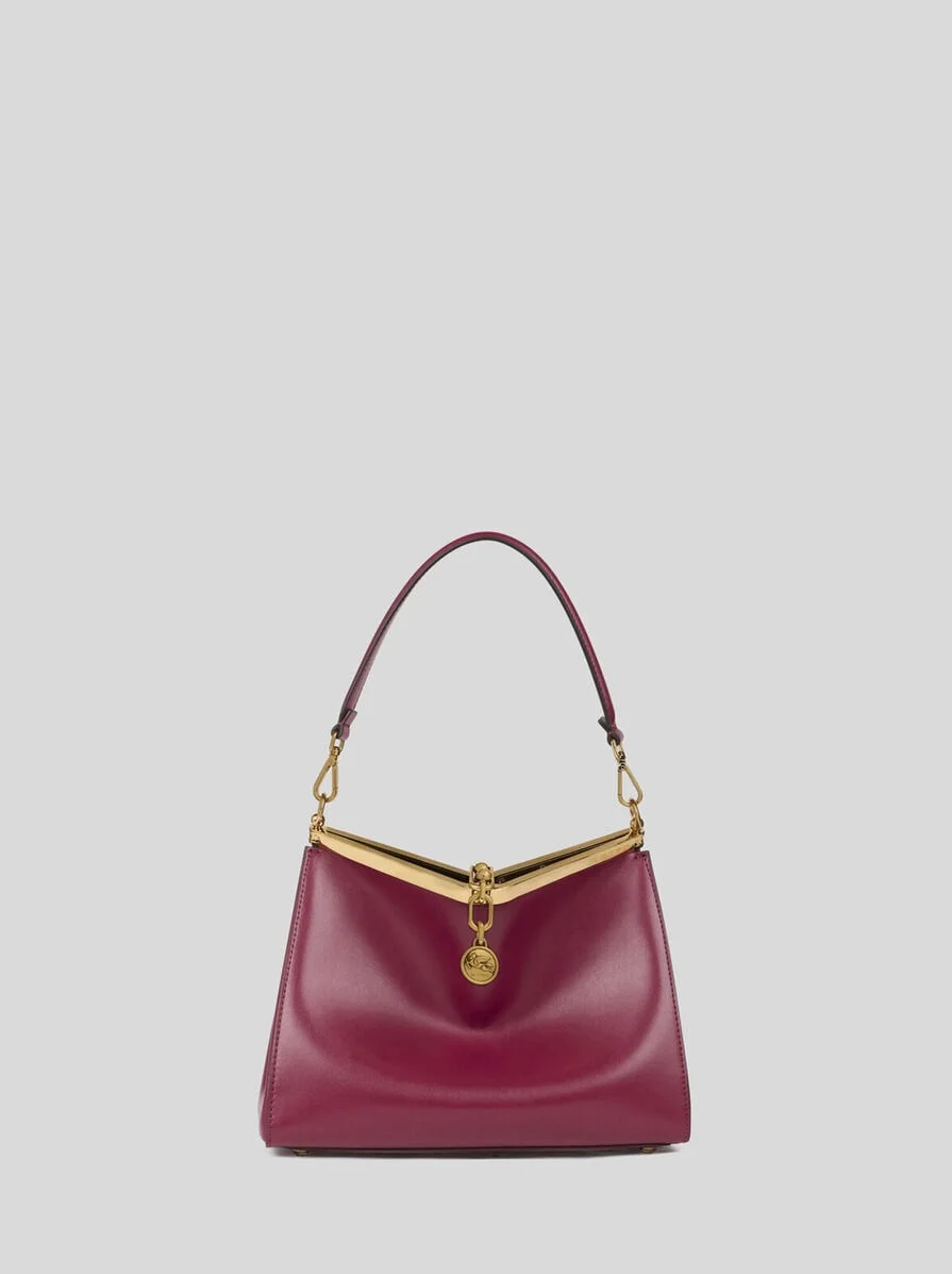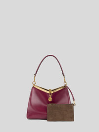 Iconic medium Vela bag in leather. This model can be carried by hand or on the shoulder thanks to the detachable and interchangeable strap and handle. This model stands out for its distinctive metal closure and the medallion bearing the ETRO logo and Pegaso symbol engraved using the same technique used to mint coins. Complete with a convenient, zip-fastened clutch inside. • Dimensions (Width, Height, Depth): 8.5 x 11 x 4.3 inches (21,5 x 28 x 11 cm) • Detachable shoulder strap • Metal feet • Removable mini pouch • Light golden-finish metal accessories • Made in Italy PRODUCT DETAILS • Exterior: 100% calfskin • Lining: 100% cowhide