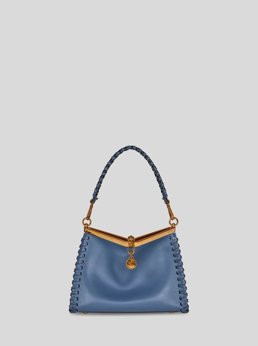 Iconic medium Vela bag in leather with thread work at the sides. This model can be carried by hand or on the shoulder thanks to the detachable and interchangeable strap and handle. This model stands out for its distinctive metal fastening and the medallion bearing the ETRO logo and Pegaso symbol engraved using the same technique used to mint coins. Complete with a convenient, zip-fastened suede clutch inside. PRODUCT DETAILS • 28 x 21 x 12 cm / 11,02 x 8,26 x 4,72 inches • Exterior: 100% calfskin • Interior: 100% calfskin • Short handle, length (drop) 24 cm / 9,44 inches • Detachable adjustable shoulder strap, 48 cm long (drop) • Metal feet • Removable mini pouch • Light golden-finish metal accessories • Made in Italy