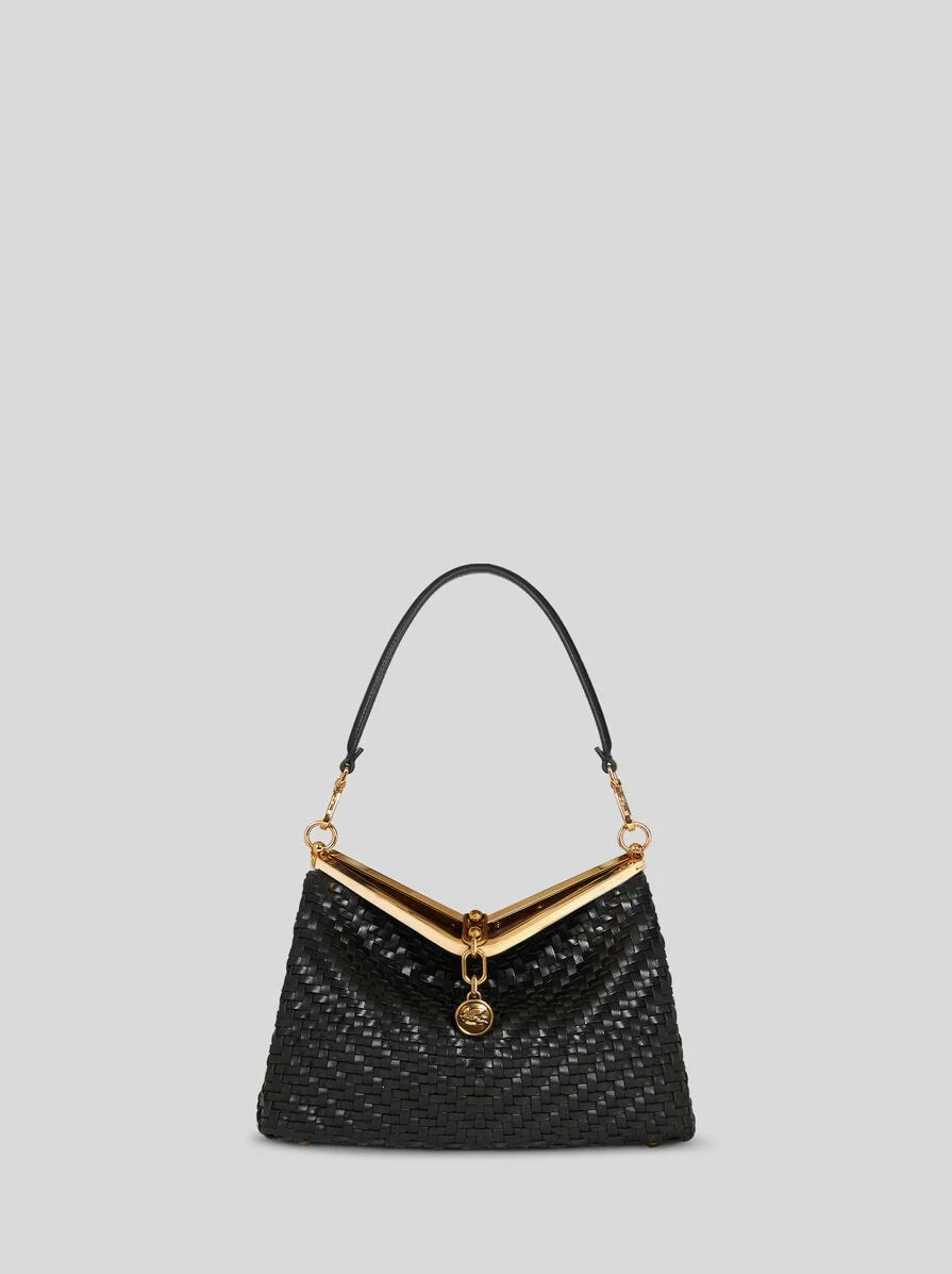 Iconic medium Vela bag in woven leather. This model can be carried by hand or on the shoulder thanks to the detachable and interchangeable strap and handle. This model stands out for its distinctive metal closure and the medallion bearing the ETRO logo and Pegaso symbol engraved using the same technique used to mint coins. Complete with a convenient, zip-fastened suede clutch inside. • Size: 21.5 x 28 x 11 cm • Detachable shoulder strap • Metal feet • Removable mini pouch • Light golden-finish metal accessories • Made in Italy PRODUCT DETAILS • 100% leather