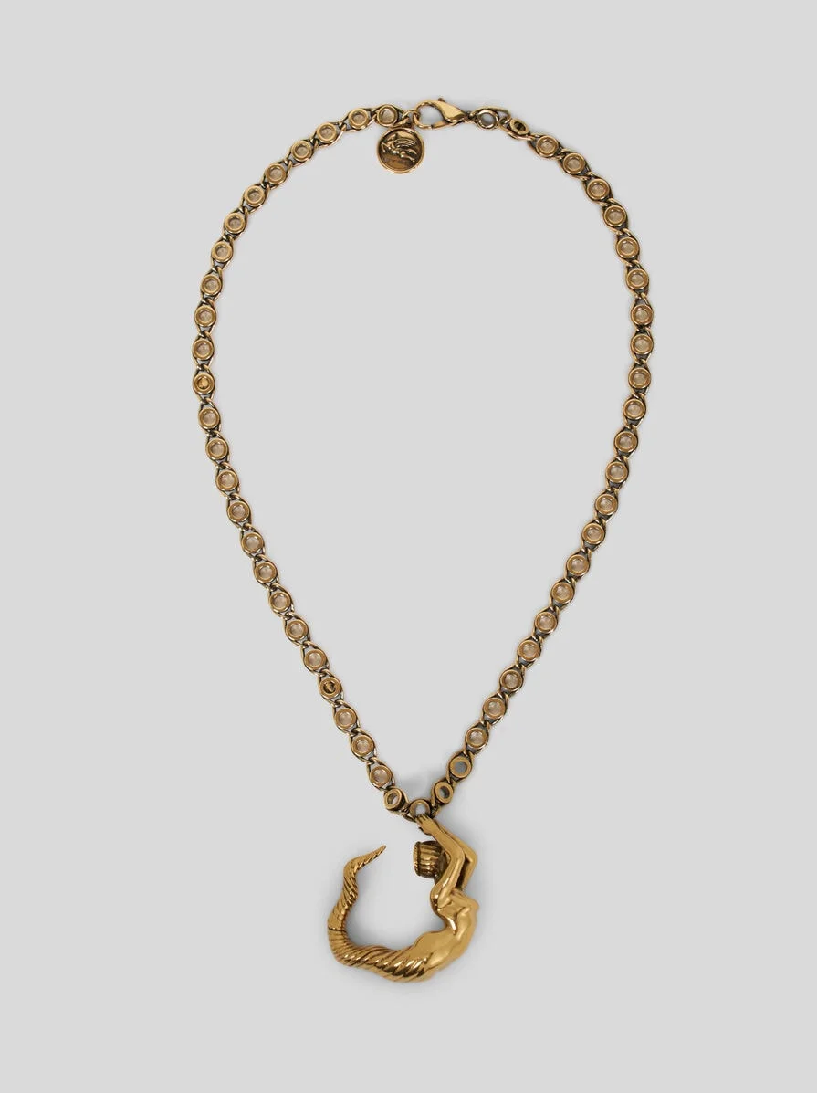 Brass necklace with link chain and mermaid pendant. This accessory, presented at the Spring-Summer 25 Women's Runway Show, is enhanced by a charm bearing the ETRO logo and Pegaso symbol engraved using the same technique used to mint coins. PRODUCT DETAILS • 100% brass