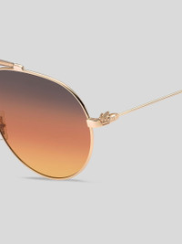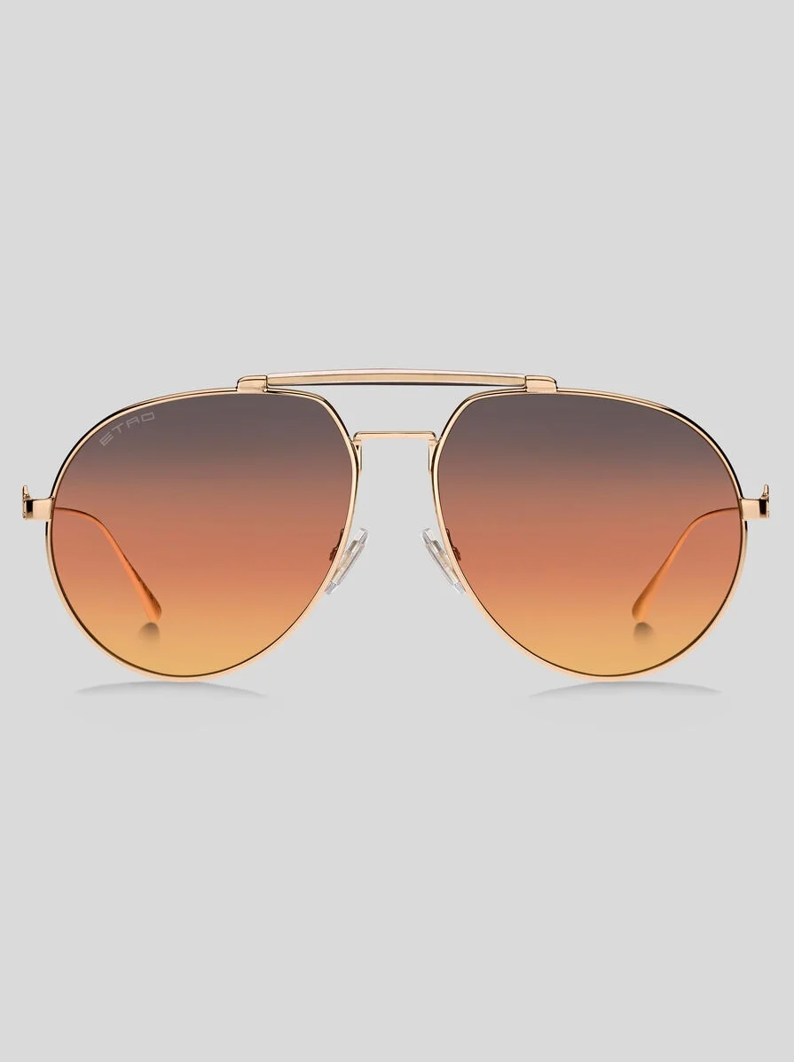 The "Metal Pegaso" eyewear collection by ETRO is a vibrant celebration of the Maison's colourful identity and timeless style. Offering extreme lightness and instantly recognisable detailing, these full-metal sunglasses are enriched with coloured inserts on the bridge that match the degrade tinted lenses for an elegant tonal effect. The three-dimensional Pegaso on the temples and the logo-inspired metal end tips are subtle symbols of the fashion house's rich heritage and iconic style. Branded nose pads and lasered "ETRO" lettering on the lens complete the frames. PRODUCT DETAILS • Frame: 100% metal • Lenses with UVA and UVB protection • Fit: International • Lenses: 2.23 inches, bridge: 0.63 inches, temples: 5.70 inches (Lenses: 56,7 mm, bridge: 16 mm, temples: 145 mm) • Made in China