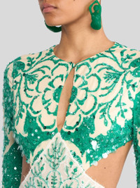 Slim-fitting midi dress with long sleeves, keyhole opening at the front and soft, draped-effect flounce at the bottom of the skirt. The item, made from see-through-effect jersey, is covered in refined lace and shiny embroidered sequins and features a contrasting, stencil-like floral print. The cut-out at the rear leaves the lower part of the back open. The item was presented at the Spring-Summer 25 Women's Runway Show. • Slim fit • Buttoned keyhole opening at the front • Long sleeves • Rear zip closure • Made in Italy • The model is 5' 9½" (177 cm) tall and wears a size 40 PRODUCT DETAILS • 100% viscose • Lace: 81% polyamide, 19% cotton • Embellishment: PVC and glass • Lining: 100% viscose