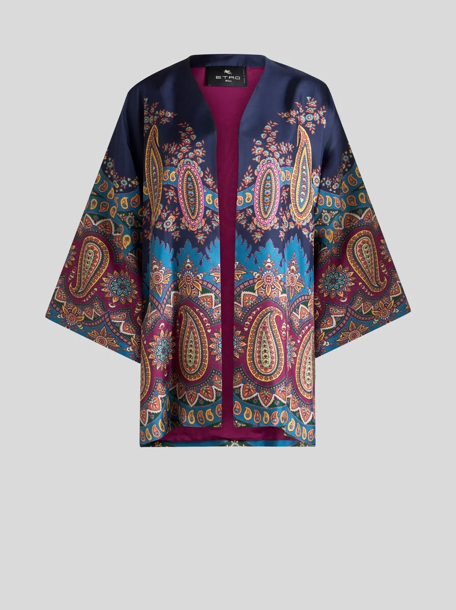 Short pure silk twill kesa robe with distinctive, placed floral Paisley print. • Regular fit • Kimono sleeves • Made in Italy PRODUCT DETAILS • 100% silk • Lining: 100% viscose