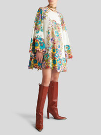 Mini dress with full skirt and wide sleeves. This model is made from cotton poplin embellished with a multicoloured bouquet-inspired print. The scalloping follows the print at the bottom. PRODUCT DETAILS • 100% cotton