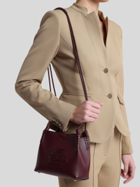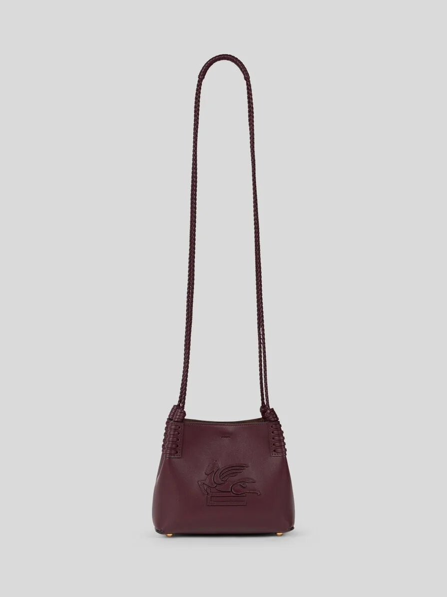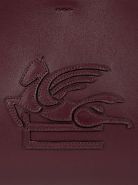 Mini Libra tote bag in plain-coloured leather embellished with a leather applique featuring the ETRO logo and Pegaso symbol embroidered on the front. Braided handles and threading on the corners of the bag. Suede interior and clasp closure. • Dimensions (Width, Height, Depth): 7.9 x 5.5 x 3.5 inches (20 x 14 x 9 cm) • Suede lining • Metal feet • Made in Italy PRODUCT DETAILS • Exterior: 100% calfskin • Lining: 100% calfskin