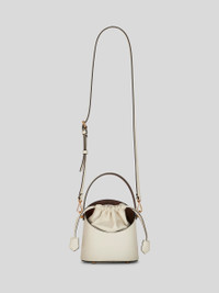 Small Saturno bucket bag in leather, with iconic Paisley jacquard fabric details. This bag stands out thanks to its oval handle and sack-like inner body with drawstring. The Saturno bag is perfect to carry by the handle or shoulder strap. Features striped inner lining. • Size: 4.72 x 7.28 x 7.09 inches (12 x 18,5 x 18 cm) • Drawstring closure • Short handle • Adjustable and detachable shoulder strap • Metal feet • Made in Italy PRODUCT DETAILS • Body: 100% leather • Detail 1: Paisley jacquard cotton fabric coated with matt texture and lined with canvas • Coating: 100% PVC • Lining: 100% polyester