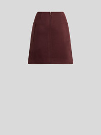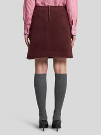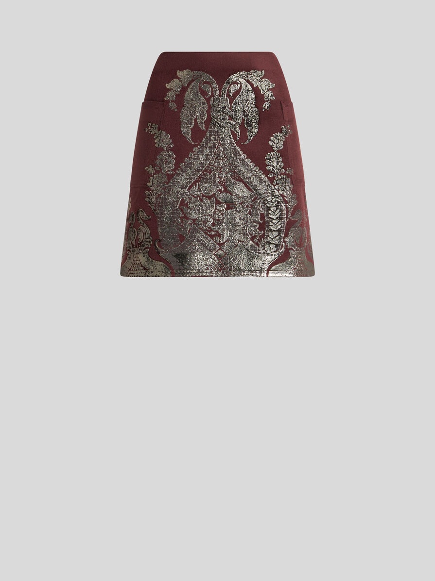 Wool and cashmere baize mini skirt featuring a metallic placed floral paisley print and an ornamental trim. PRODUCT DETAILS • 90% wool, 10% cashmere • Lining: 52% viscose, 48% acetate