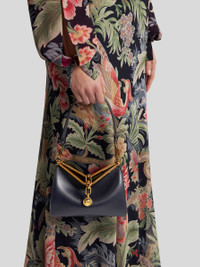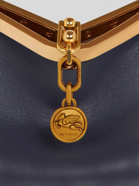 Mini Vela bag in leather with metal chain closure enhanced by a medallion bearing the ETRO logo and Pegaso symbol. This bag is perfect to carry on the shoulder or crossbody. • Dimensions (Width, Height, Depth): 8.3 x 6.3 x 3.5 inches (21 x 16 x 9 cm) • Short shoulder strap, length (drop) 10.6 inches (27 cm) • Detachable adjustable shoulder strap, 21.7 inches (55 cm) long (drop) • Metal feet • Light golden-finish metal accessories • Made in Italy PRODUCT DETAILS • Exterior: 100% calfskin • Interior: 100% cowhide