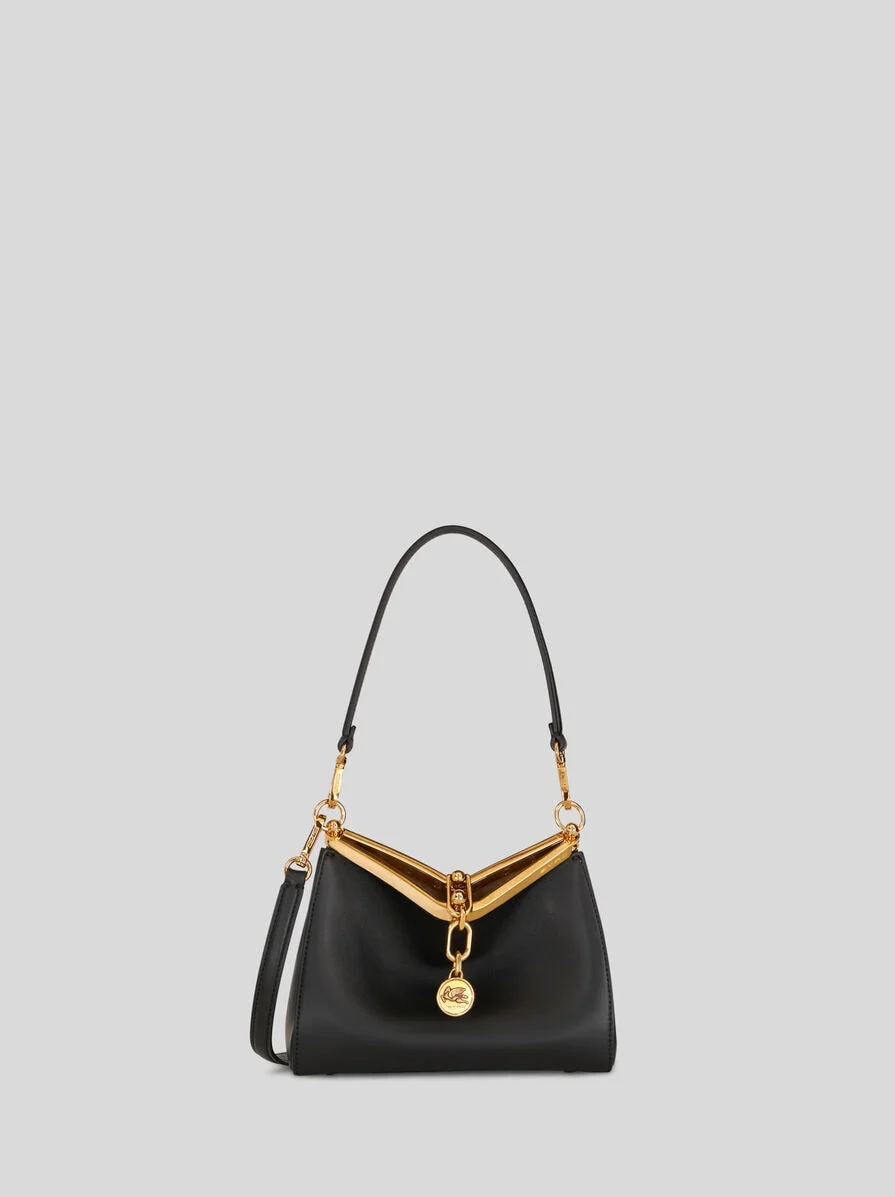 Mini Vela bag in leather with metal chain closure enhanced by a medallion bearing the ETRO logo and Pegaso symbol. This bag is perfect to carry on the shoulder or crossbody. • Dimensions (Width, Height, Depth): 8.3 x 6.3 x 3.5 inches (21 x 16 x 9 cm) • Short shoulder strap, length (drop) 10.6 inches (27 cm) • Detachable adjustable shoulder strap, 21.7 inches (55 cm) long (drop) • Metal feet • Light golden-finish metal accessories • Made in Italy PRODUCT DETAILS • Exterior: 100% calfskin • Interior: 100% cowhide