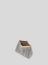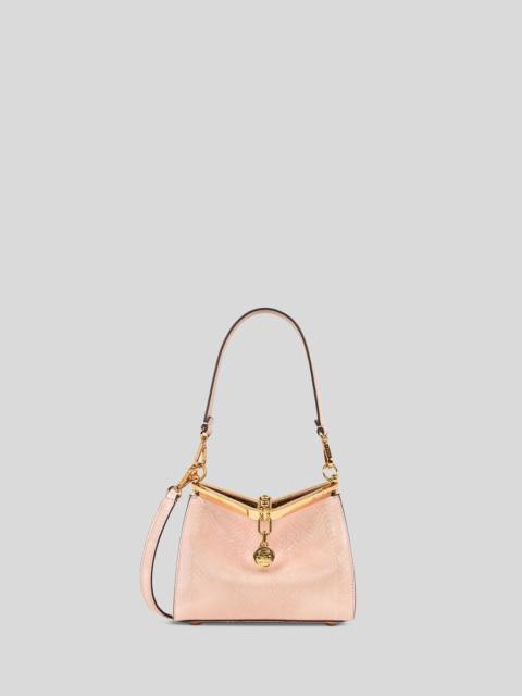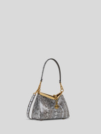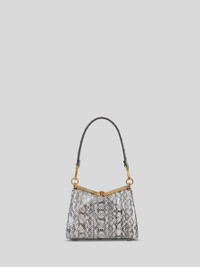Iconic small Vela bag in fine Elaphe leather. This model can be carried by hand or on the shoulder thanks to the detachable and interchangeable strap and handle. This model stands out for its distinctive metal closure and the medallion bearing the ETRO logo and Pegaso symbol engraved using the same technique used to mint coins. • Dimensions (Width, Height, Depth): 8.3 x 6.3 x 3.5 inches (21 x 16 x 9 cm) • Removable handle and shoulder strap • Metal feet • Golden-finish metal details • Made in Italy PRODUCT DETAILS • Exterior: aquatic snakeskin • Trims: calfskin • Lining: calfskin