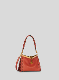 Iconic mini Vela bag in leather with thread work at the sides. This model can be carried by hand or on the shoulder thanks to the detachable and interchangeable strap and handle. This model stands out for its distinctive metal fastening and the medallion bearing the ETRO logo and Pegaso symbol engraved using the same technique used to mint coins. PRODUCT DETAILS • 8.26 x 6.29 x 3.54 inches (21 x 16 x 9 cm) • Exterior: 100% calfskin • Interior: 100% calfskin Short shoulder strap length 10.62 inches (27 cm) - drop • Detachable adjustable shoulder strap: 21,65 inches (55 cm long) - drop • Metal feet • Light golden-finish metal accessories • Made in Italy