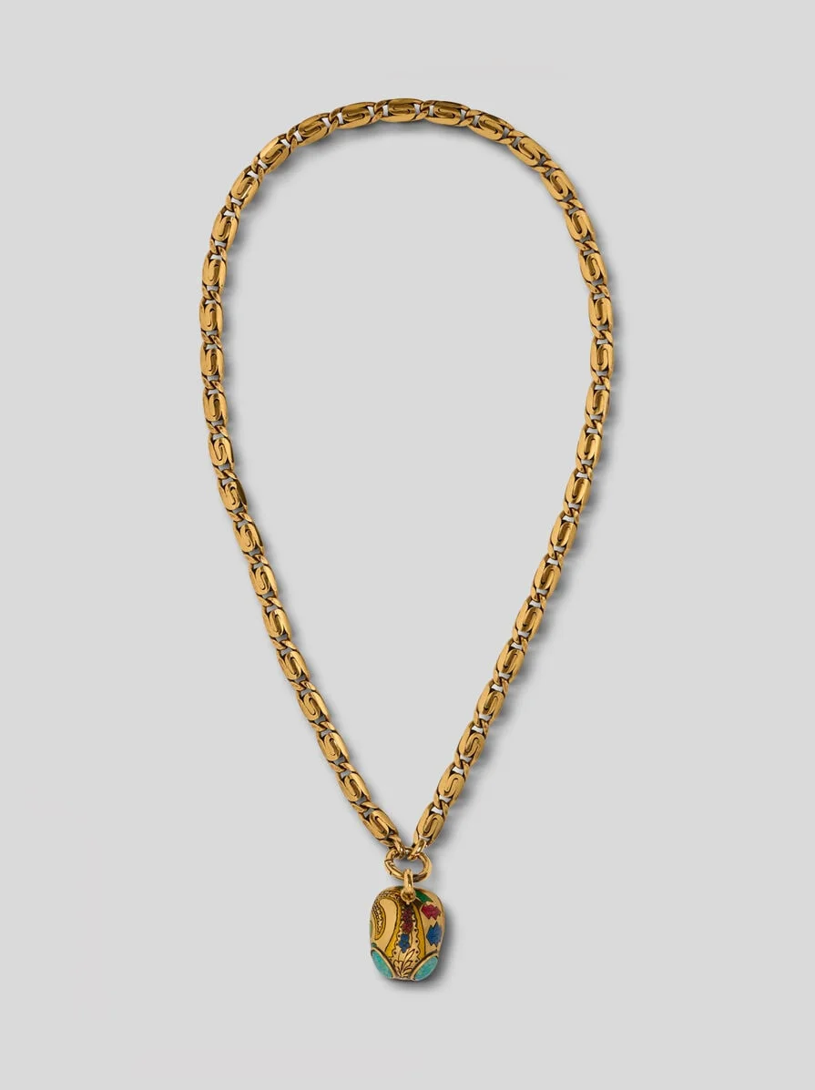 Brass chain-link necklace with pendant inspired by the head of an alien, enhanced by engraved floral details and coloured elements and two multicoloured stones. The accessory was presented at the Autumn-Winter 25 Runway Show. • Length: 31.5 inches (80 cm) • Made in Italy PRODUCT DETAILS • Body: 100% brass • Chain: 100% brass • Appliques: 100% silicone