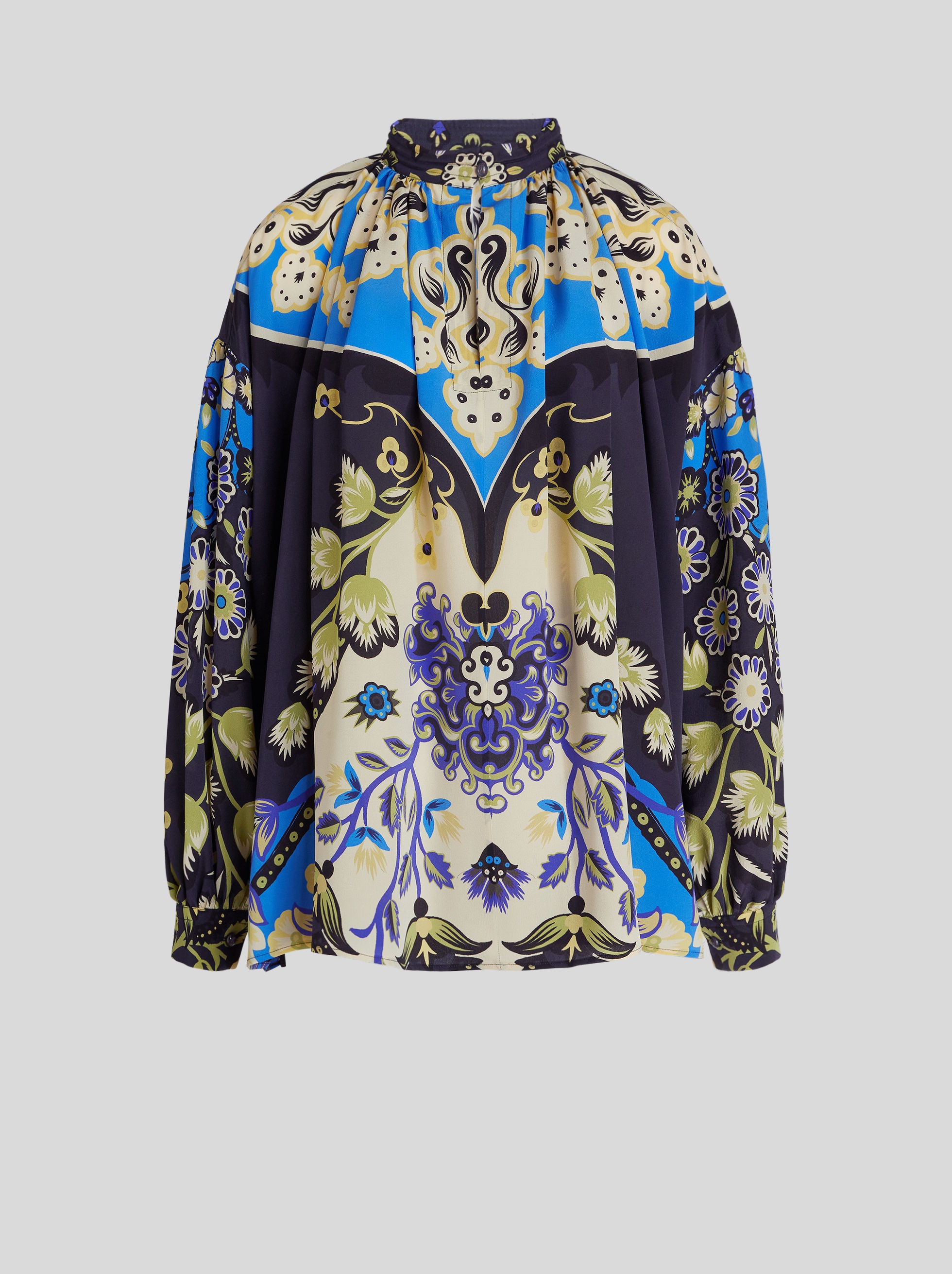 Silk blouse with a placed print of ornamental elements with flowers and leafy foliage. PRODUCT DETAILS • 100% silk • Oversize • Mandarin collar • Button fastening • Long balloon sleeves • Cuffs with single button • Mother-of-pearl buttons • Made in Italy • The model is 180 cm tall and wears size 40 Sku: 222D1342350780001