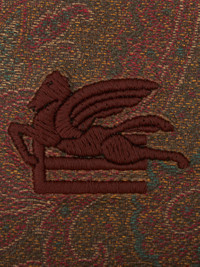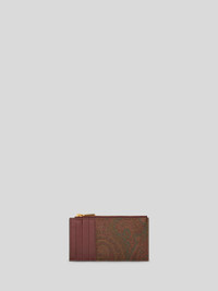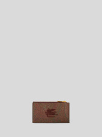 Card holder in ETRO's iconic Paisley jacquard fabric embellished by embroidered ETRO Pegaso logo. PRODUCT DETAILS • 14.5 x 8 cm / 5.70 x 3.14 inches • Exterior: Canvas-lined coated Paisley jacquard cotton with matt grain • Rear: 100% cotton • Details in PVC • Finish: 100% calfskin • Embroidery: 100% polyester • Interior: 100% calfskin • Lining: 100% nylon • Four card spaces • Zip fastening • Gold-finish metal accessories • Made in Italy