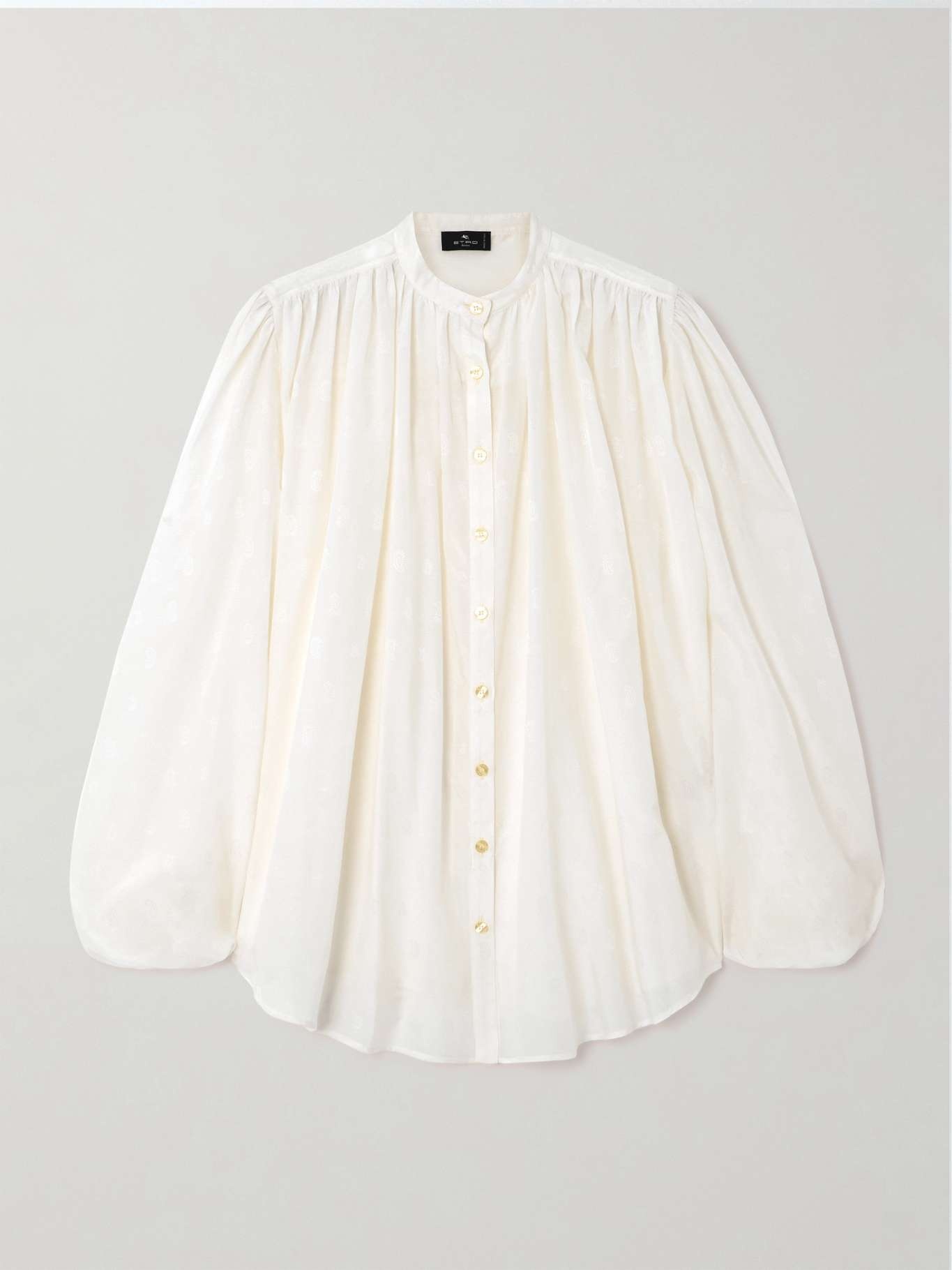 EDITORS'NOTES Etro often draws inspiration from centuries past. This blouse is made from cotton and silk-blend and has billowy pleats flowing from the neckline. Look closely and you'll see the label's iconic paisley swirls printed in tonal ivory. SIZE & FIT Model measurements: - Fits true to size, take your normal size - Cut for a loose fit - Lightweight, semi-sheer, non-stretchy fabric - Model is 180cm/ 5'11" and is wearing an IT 40 - Bust: 85cm/ 33.5" - Waist: 62cm/ 24.5" - Hip: 88cm/ 34.5" DETAILS & CARE - Tonal-ivory cotton and silk-blend - Button fastenings through front - 60% cotton, 40% silk - Dry clean