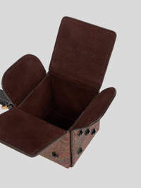 Cube-shaped coin purse in iconic Paisley jacquard fabric dotted with rhinestones arranged to resemble the numbers on a die. This accessory is complete with an adjustable, embossed-effect wristlet. • Dimensions (Width, Height, Depth): 2.1 x 2.1 x 2.1 inches (5,5 x 5,5 x 5,5 cm) • Etro logo-branded suede interior • Buckle-adjustable wristlet • Made in Italy PRODUCT DETAILS • Exterior: Paisley jacquard cotton fabric coated with matt texture and lined with canvas • Coating: 100% PVC