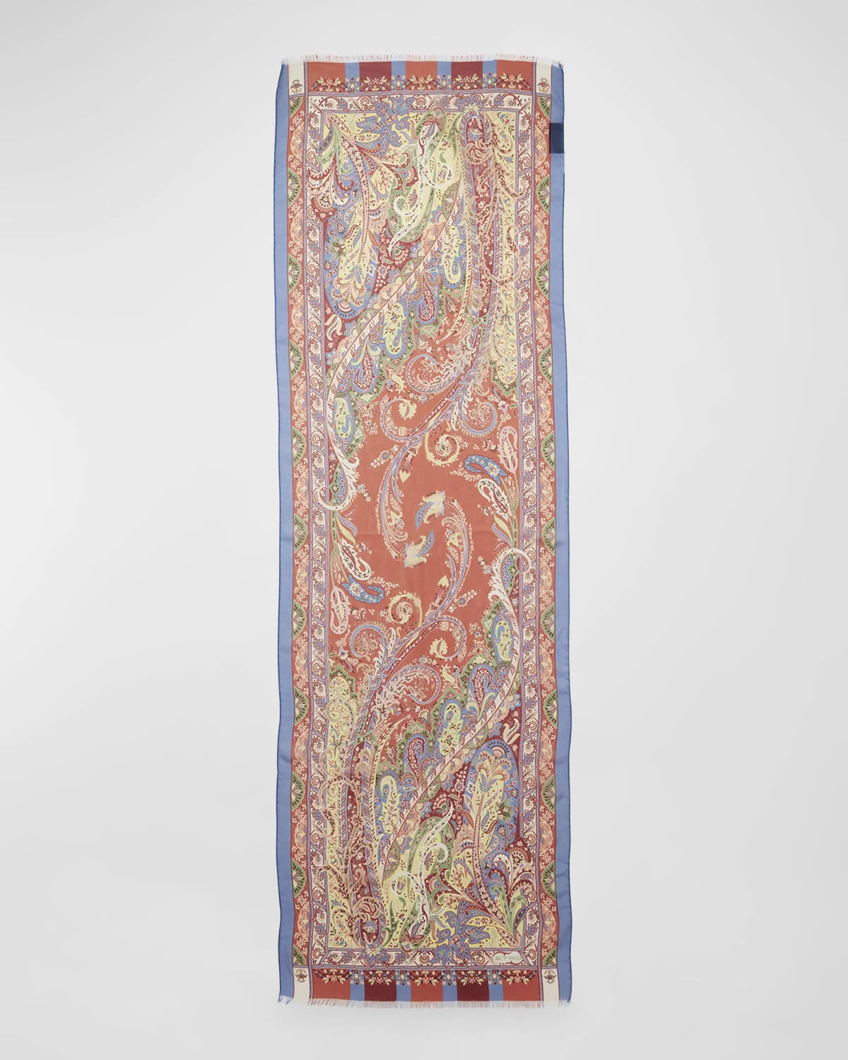 - Etro sheer paisley and floral print scarf in silk - Approx. 55"L x 18"W - Logo accent - Eyelash fringe - May be styled in multiple ways - Professional cleaning recommended - Made in Italy