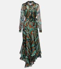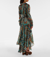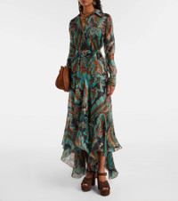 Paisley prints are so synonymous with Etro that they've become a house signature. One is featured on this gown, made from silk into a fitted silhouette with fringed trims and a ruffled hemline. Product Details - Material: 100% silk - Care instructions: dry clean - Made in Italy - Designer color name: Print On Black Base - Item color: black, multicolor - Lining: 100% polyester - Collar: Cuban - Closure: buttoned placket, zipped side - Pockets: rounded chest pocket - Detachable belt - Hem: uneven - Detachable lining - Item number: P01072805 Size & Fit - True to size - Loose fit, comes with belt - Non-stretchy fabric - The model seen in the picture is 178cm-5'10" and wearing a size IT 40