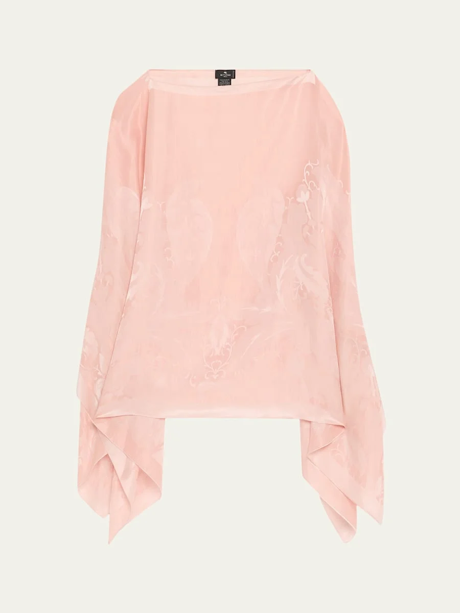 Etro elegant cape top embellished with a decorative floral jacquard motif Bateau neckline Cape sleeves Handkerchief hem Loose fit Slipover style Silk/cotton/viscose Professional cleaning recommended Made in Italy Online Inquiries: BGS21_D5BFW| Store Inquiries: #5062772