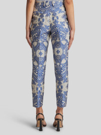 Cigarette trousers with high waist and pressed creases. This model is made from silk-blend fabric and stands out for its jacquard lace motif all over. • Cropped cigarette fit • High waist • Concealed hook and zip closure • Side pockets • Rear welt pockets • Made in Italy • The model is 5' 9½" (177 cm) tall and wears a size 40 PRODUCT DETAILS • 76% polyester, 15% silk, 9% polyamide