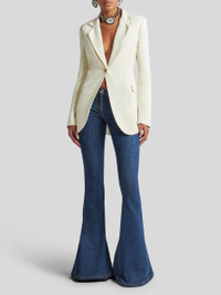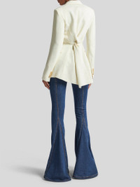 Cinched-waist jacket in plain-coloured stretch cady embellished with tonal Paisley jacquard motif all over. The item, presented at the Spring-Summer 25 Women's Runway Show, also stands out for the knot detail on the back. • Fitted • Side slip pockets with flap • Single-breasted closure with horn button • Working cuffs with horn buttons • Knot detail on the back • Made in Italy • The model is 5' 9½" (177 cm) tall and wears a size 40 PRODUCT DETAILS • 97% viscose, 3% elastane • Lining: 52% viscose, 48% acetate