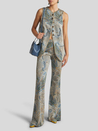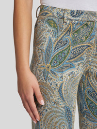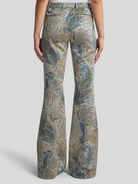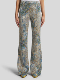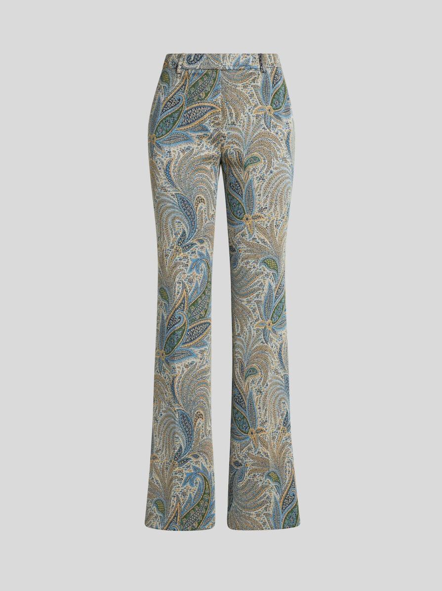 Trousers with flared hems and pressed creases. This stretch cotton-blend jersey garment is embellished with a Paisley jacquard motif all over. • Slim fit • Regular-rise waist • Concealed hook and zip closure • Rear welt pockets • Made in Italy • The model is 5' 9½" (177 cm) tall and wears a size 40 PRODUCT DETAILS • 54% polyester, 21% viscose, 21% cotton, 3% polyamide, 1% elastane