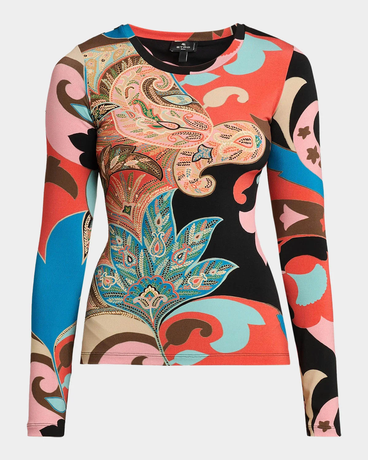 A vibrant tapestry of house codes, this long-sleeve mesh top merges a graphic lotus motif with Etro's iconic Paisley scroll, plus & nbsp;tonal contrast topstitching on the cuffs and hem for an artisanal touch. Jewel neckline Long sleeves Pullover style Polyester/elastane Dry clean Made in Italy SIZE & FITModel measurements: 5 & apos;10" tallModel is wearing a US size 4/Small