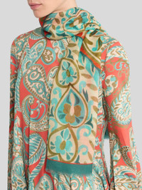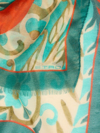 Wool- and cashmere-blend scarf with colourful Paisley motif and contrasting edges. This accessory, presented at the Autumn-Winter 25 Runway Show, is complete with slightly frayed short sides and the ETRO logo in the corner. • Size: 17.7 x 55.1 inches (45 x 140 cm) • Made in Italy PRODUCT DETAILS • 90% wool, 10% cashmere