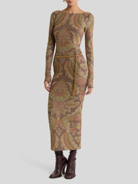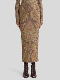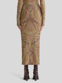 Midi-length pencil skirt in terry jersey fabric with lurex and decorative all-over floral print. The item was presented at the Autumn-Winter 25 Runway Show. • Fitted • High waist • Elasticated waist • Made in Italy • The model is 5' 9½" (176 cm) tall and wears a size 40 PRODUCT DETAILS • 65% polyamide, 30% polyester, 5% elastane