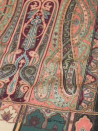 Cashmere- and silk-blend scarf with decorative, elaborate Paisley print. Completing the accessory are the slightly frayed short sides, striped pattern and an Etro logo in the corner. • Size: 27.6 x 66.9 inches (70 x 170 cm) • Made in Italy PRODUCT DETAILS • 70% cashmere, 30% silk