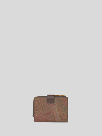 Wallet in iconic Paisley jacquard fabric. This accessory is embellished with a metal button bearing the raised Pegaso symbol and an etched Etro logo on the inside. • Dimensions (Width, Height): 4.3 x 3.1 inches (11 x 8 cm) • Flap and press-stud closure • Golden-finish metal details • Pegaso button • Zipped main pocket • Six card slots • Made in Italy PRODUCT DETAILS • Exterior: Paisley jacquard cotton fabric coated with matt texture and lined with canvas • Coating: 100% PVC • Trims: calfskin • Details: calfskin • Interior: 100% nylon