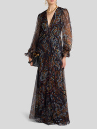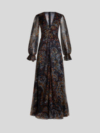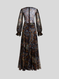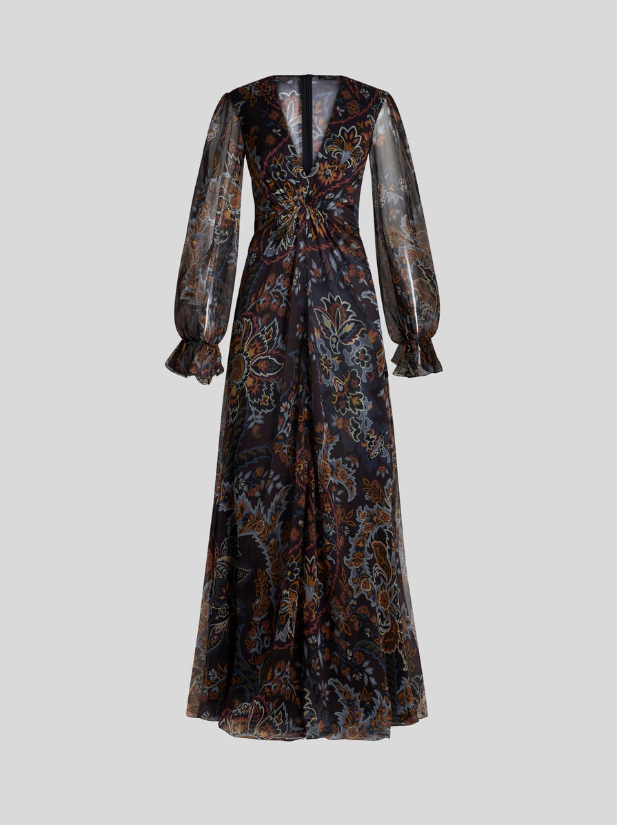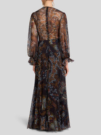 Long silk crepon dress with decorative floral Paisley print. This model features an inner bodysuit. PRODUCT DETAILS • 100% silk • Lining: 100% polyester