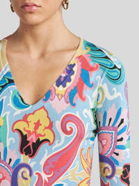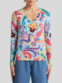 Long-sleeved V-neck sweater in stretch silk fabric. This garment features a multicoloured floral print all over. • V-neck • Long sleeves • Made in Italy • The model is 5' 9½" (177 cm) tall and wears a size 40 PRODUCT DETAILS • 85% silk, 9% polyamide, 6% elastane