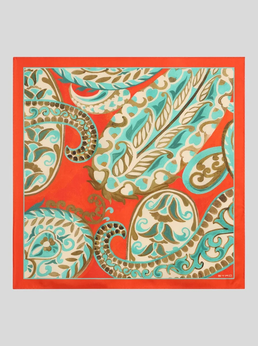 Pure silk twill scarf with multicoloured Paisley print. This accessory, presented at the Autumn-Winter 25 Runway Show, is complete with the ETRO logo in the corner. • Size: 27.6 x 27.6 inches (70 x 70 cm) • Made in Italy PRODUCT DETAILS • 100% silk