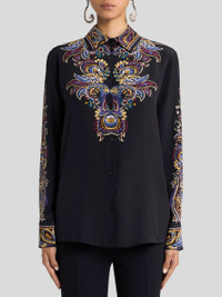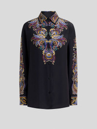 Straight-cut, relaxed-fit shirt in pure silk crepe de chine with distinctive print featuring Paisley and foliage-inspired elements. The small buttons with ETRO logo give the garment a customised touch. • Boyfriend fit • Pointed collar • One-button working cuffs • Branded-button closure • Made in Italy • The model is 5' 9½" (176 cm) tall and wears a size 40 PRODUCT DETAILS • 100% silk