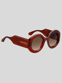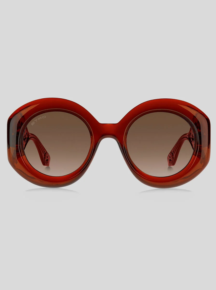 ETRO's "Paisley" eyewear collection embraces one of the Maison's most distinctive style codes: the eponymous Paisley pattern. Renowned for its exquisite fabrics, the house has reimagined this timeless motif in a myriad of captivating forms and chromatic expressions; these sunglasses, designed to be lightweight and comfortable to wear, reveal the motif as a sophisticated engraving on the internal part of transparent coloured temples. Precious metal wirecores, iconic end tips and discreet ETRO branding lend a signature finishing touch. PRODUCT DETAILS • Frame: 100% polyamide • Lenses with UVA and UVB protection • Fit: Global fit • Lenses: 1.90 inches, bridge: 0.94 inches, temples: 5.70 inches (Lenses: 48,5 mm, bridge: 24 mm, temples: 145 mm) • Made in China