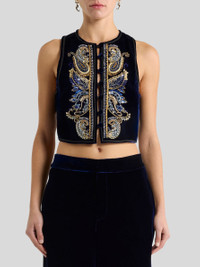 CROPPED VELVET WAISTCOAT WITH PAISLEY FOLIAGE EMBROIDERY