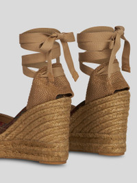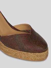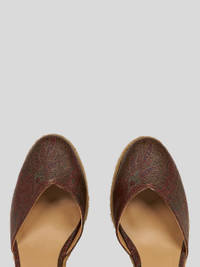 Wedge espadrilles in iconic Paisley jacquard fabric with elegant V-shaped peep-toe opening. This model features Roman-style lacing and a woven jute wedge and sole. • Total height: 4.3 inches (11 cm) • Heel height: 3.1 inches (8 cm) • Platform height: 1.2 inches (3 cm) • Made in Spain PRODUCT DETAILS • Upper: Paisley jacquard cotton fabric coated with matt texture and lined with canvas • Lining: 100% cowhide
