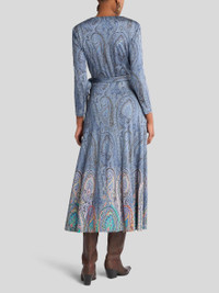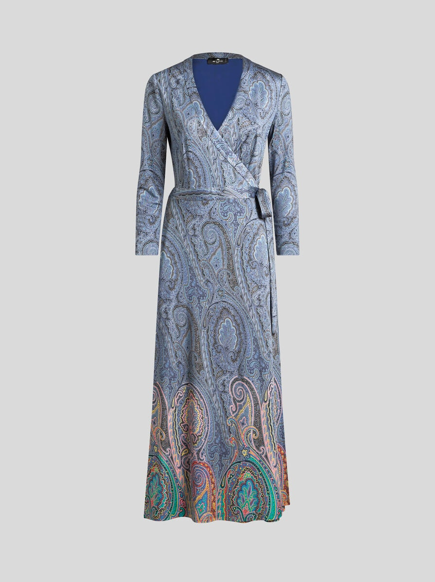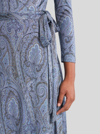 Stretch jersey midi dress with decorative Paisley motif all over, sporting a contrasting colour at the bottom. This model has a wraparound-style design. • Regular fit • V-neck • Three quarter-length sleeves • Made in Italy • The model is 5' 9½" (177 cm) tall and wears a size 40 PRODUCT DETAILS • 96% viscose, 4% elastane • Lining: 100% viscose